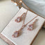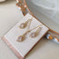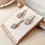 ¡Brilla con el juego de aretes y dije JUEGO NE16! Hecho con chapa de oro, oro rosa o plata, cada pieza presenta un cristal austriaco en corte pera, que aporta un brillo y elegancia únicos. Su diseño entrelazado simboliza el amor eterno. ¡Completa tu look nupcial con este encantador juego!