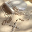 Lazo con baño de plata, cristal cortado tipo ámbar, casquillo en flor, cadena de joyería y cruz de cristal navette.