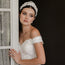 Tiara Artemisa para una novia bohemia con flores de pasta en tono ivory, azahares nacarados con terminado veteado y hojas en tono plata.  Un diseño glamuroso y atemporal, Tiara Artemisa añade un brillo sutil con sus cuentas de flores en tonos marfil, perlas luminosas y hojas plateadas. ¡Úsala para un acabado impresionante y romántico para tu look!