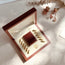 El set Sancte cuenta con un estuche en marcado en madera de nogal dando un aspecto contemporáneo, las arras son en chapa de plata, oro u oro rosa en su reversa tiene un cristal circonia que le da el toque elegante