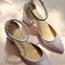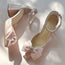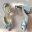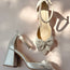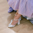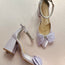 Zapatilla tipo stiletto  abierta con correa brillante y aplicación de moño textil y botón de cristalería austriaca